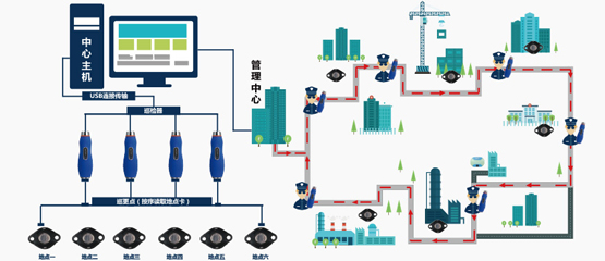 无线巡更系统由信息钮扣、巡更手持记录器、下载器、电脑及其管理软件等组成。信息钮扣安装在现场,如各住宅楼门口附近、车库、主要道路旁等处;巡更手持记录器由巡更人员值勤时随身携带;下载器是联接手持记录器和电脑进行信息交流的部件,它设置在电脑房。无线巡更系统具有安装简单,不需要专用电脑,而且,系统扩容、修改、管理非常方便。
